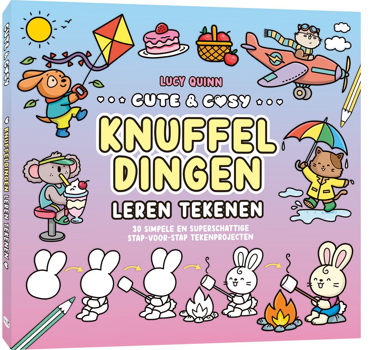 Voor iedereen die dol is op de cute & cosy kleurboekentrend is er nu cute & cosy tekenen! In de stap-voor-stap tutorials leer je zelf 25 ultraschattige figuurtjes tekenen plus vijf knusse kamertjes. Op de linkerpagina zie je hoe je een tekening in zes stappen opbouwt en op de rechterpagina staat een beginnetje om je op weg te helpen. Met de tips kun je een eigen draai geven aan je tekeningen. Dus zoek een knus plekje uit, pak je favoriete materialen erbij en voor je het weet maak je je eigen cute & cosy kunstwerken!